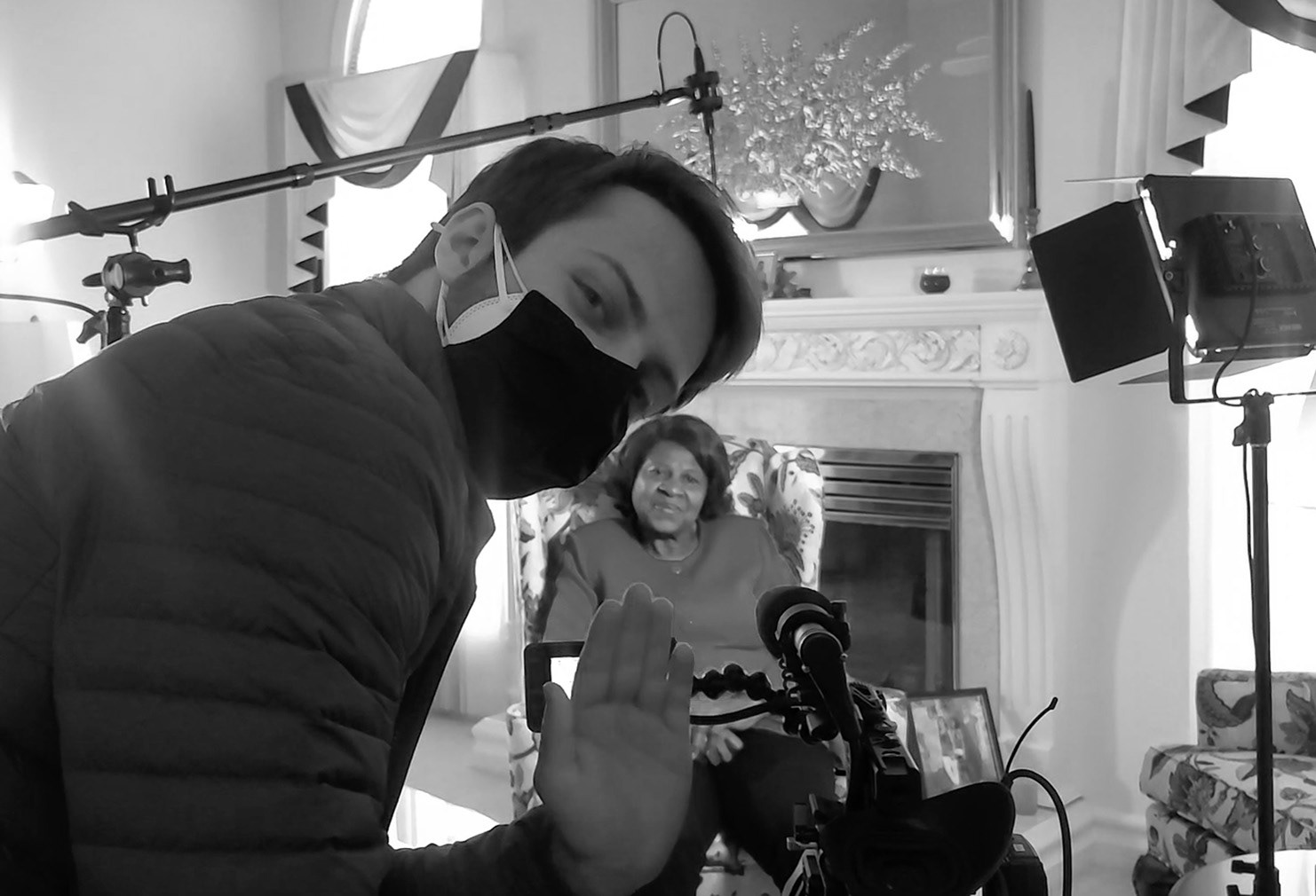 Setting up interview between Joel Ferguson and Rev. Jesse Jackson. Photo by Tina Miller. (2022)